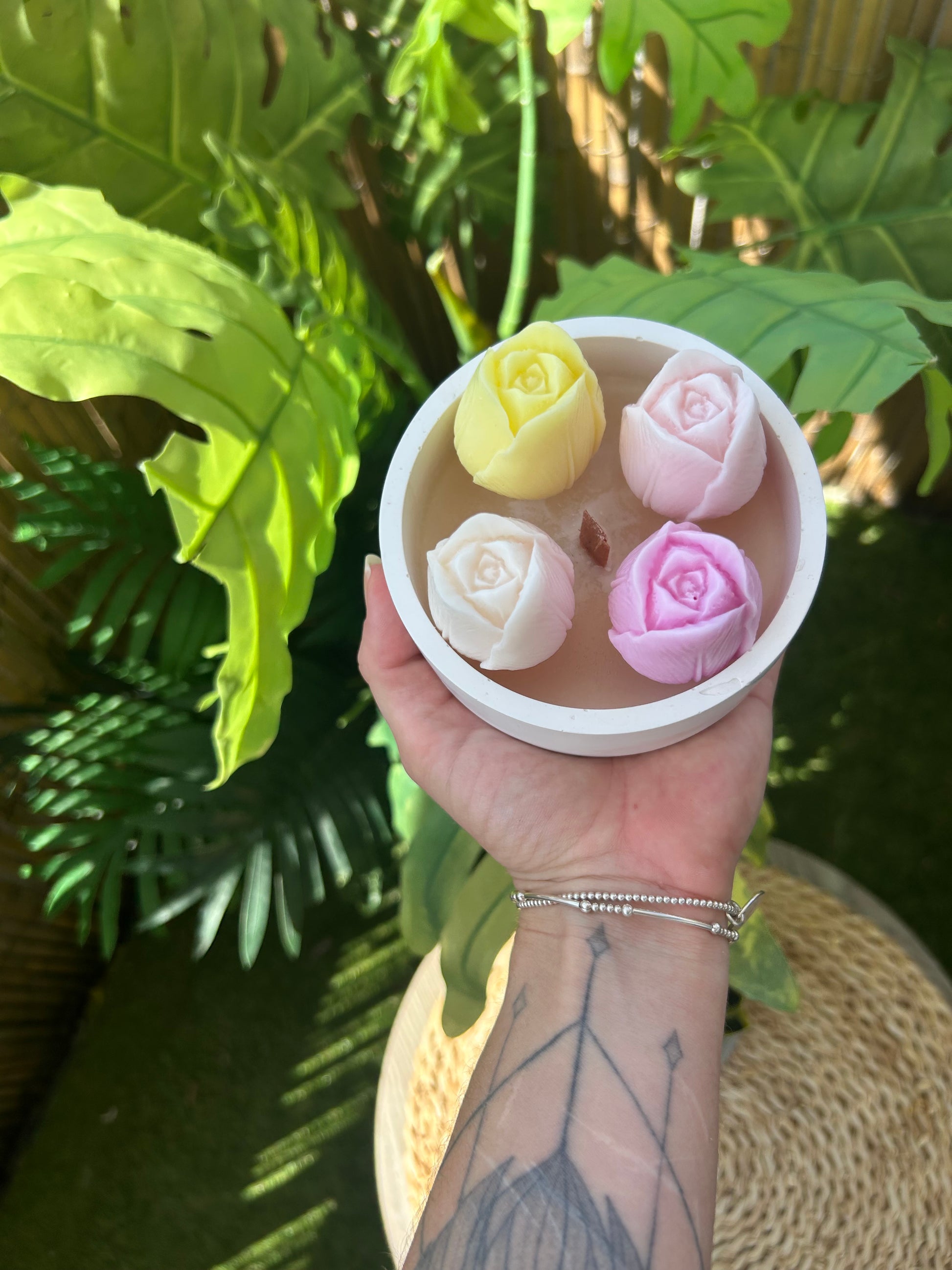 Cette bougie est accompagnée de 4 fondants parfumés, à faire fondre dans la cire ou à utiliser séparément selon vos envies 🌷