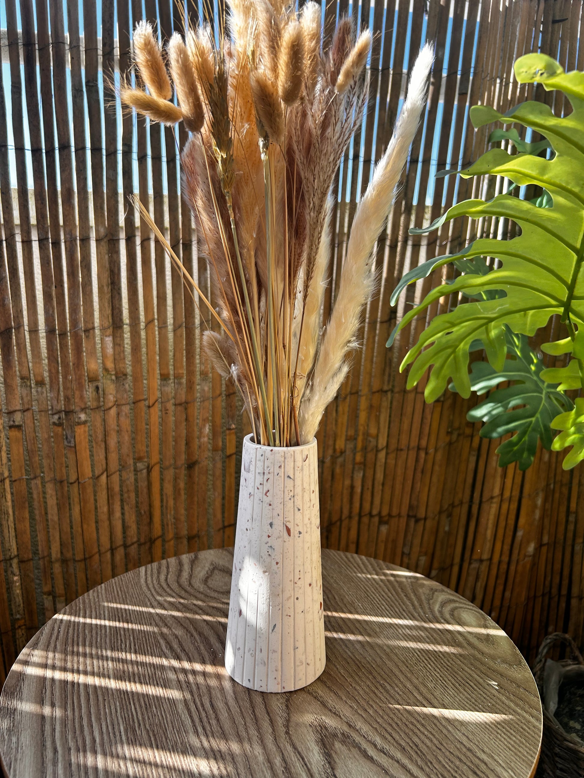 Ce sublime vase en édition Terrazzo allie élégance et authenticité. Avec ses 18 cm de hauteur, il a été imperméabilisé pour accueillir des fleurs fraîches – veillez toutefois à ne pas laisser d’eau stagnante trop longtemps pour préserver sa beauté.